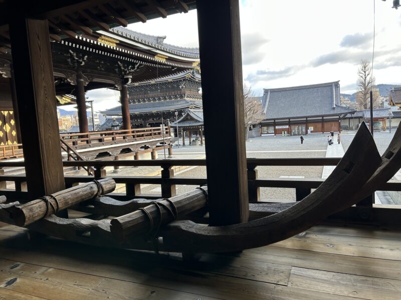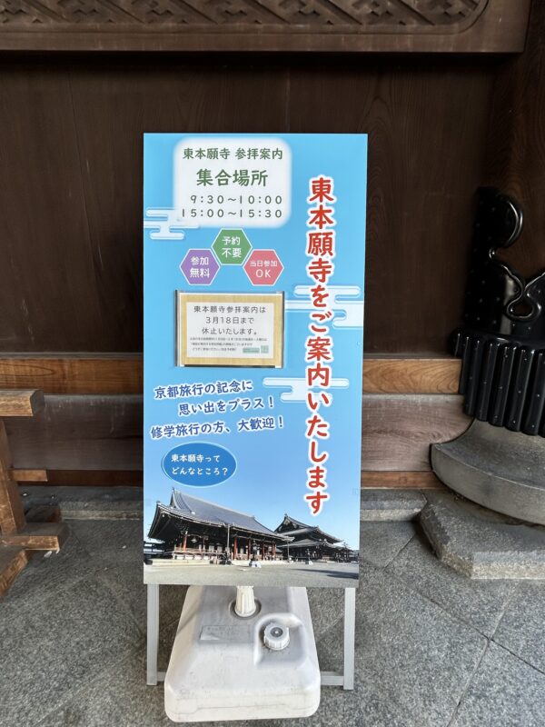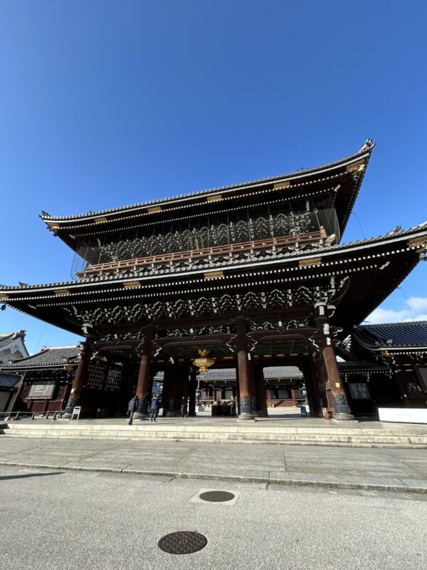 京都駅から一番近くて大きなお寺は浄土真宗の東本願寺です。門徒さんだけでなくたまたま通りがかった観光客もふらっと立ち寄る事のできるいつでも賑わうお寺です。正門前は市民緑地広場 お東さん広場としてマルシェや音楽のライブイベントも開催されていますので、週末はとても楽しい雰囲気になります。東本願寺では日に2回、職員による無料説明ツアーが行われています。(2026年3月28日までは休止中)