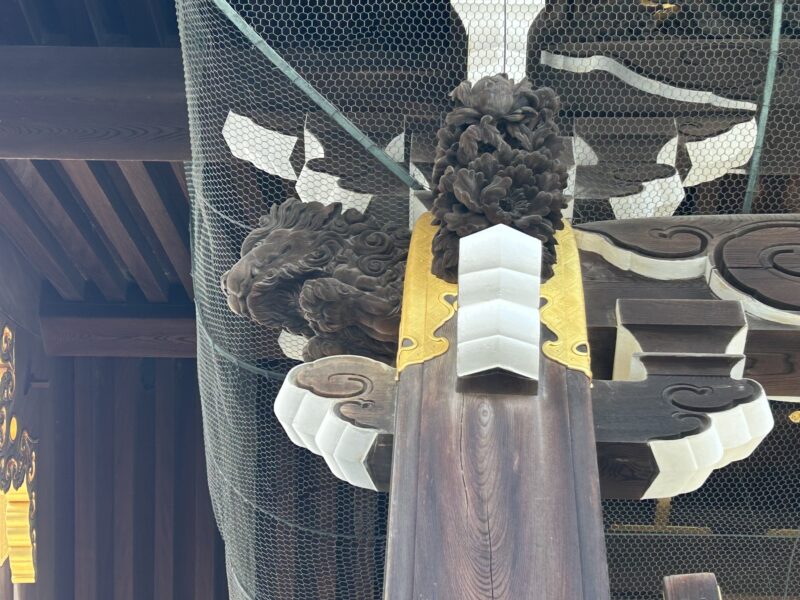 正面の御影堂門は、さすがの風格です。楼上には仏像が安置されています。門一面には美しい彫刻が施され、そして大きな大きな門は一枚板からできているのです。直径2メートルはある門なので、元の木は当然それよりも直径が大きかったことが明らかです。それほどの木が全国から京都へ送られてきたことがわかる資料を後程見学することができます。