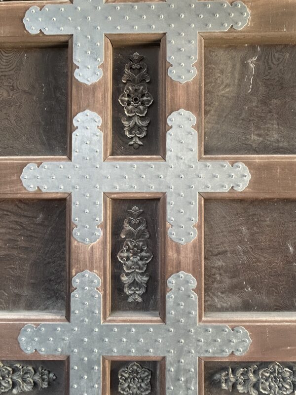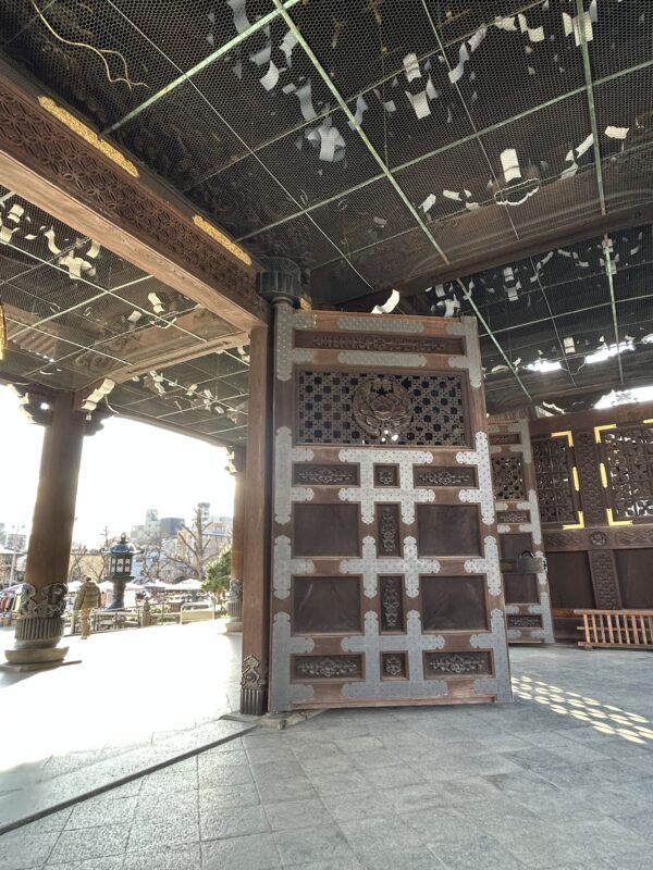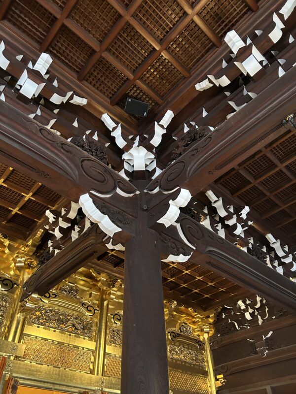 The main entrance gate, the Goeidōmon, truly possesses a dignified presence. Buddha statues are enshrined on the upper floor. The entire gate surface is adorned with exquisite carvings, and this enormous gate is crafted from a single piece of wood. With a diameter of at least two meters, it’s clear the original tree was even larger. Later, you can view historical records showing that such massive timber was transported from all over the country to Kyoto.