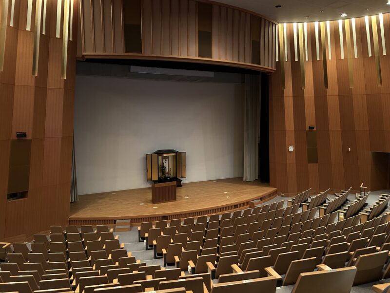阿弥陀堂と御影堂以外にも見どころは沢山あります。コンクリートの神殿のようなたたずまいの視聴覚ホールは地下に作られたホールです。建築家高松伸氏によりデザインされ海外からも見学に来られるそうです。三日月と太陽のデザインの大きな天窓から光が入りますので、地下と言っても圧迫感はありません。