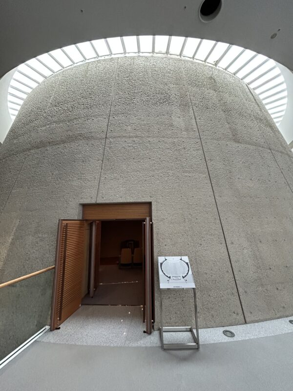 There are many other points of interest beyond the Amida Hall and the Goeido Hall. The audiovisual hall, with its concrete, temple-like exterior, is located underground. Designed by architect Shin Takamatsu, it reportedly attracts visitors from overseas. Despite being underground, it feels open and airy, as light streams in through a large skylight featuring a crescent moon and sun design.