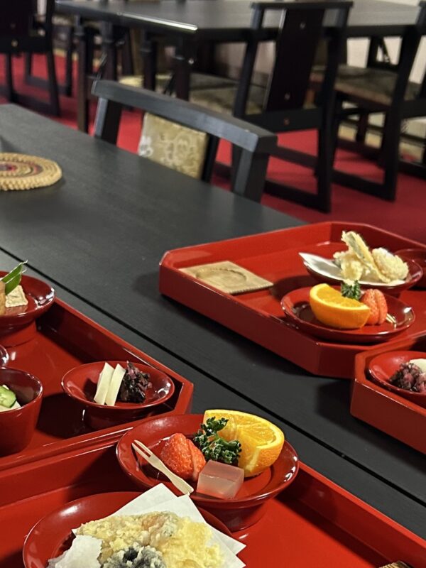 予約制で数量限定ではありますが、重要文化財に指定されて通常非公開の白書院では精進料理をいただく事ができます。また非公開のエリアではありますが、能舞台では年末の歌番組の中継場所やライブ会場として使われたり、書院では映画の撮影も行われるそうです。宮御殿には、明治天皇からいただき、大宮御所から運ばれた貴重な襖が沢山あり、畳の縁は珍しい赤色でした。天然のべニバナで染められたものだそうです。