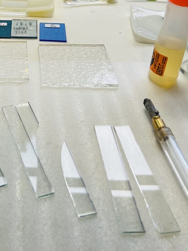 First, I practiced cutting glass. I took a square piece of clear glass on which black lines had been drawn with a marker. I traced along these lines vertically with a glass cutter. Listening out for the zzzz sound, I scored the glass surface. Then, using special pliers, I gripped the glass about 1 centimeter along the score line and it cracked along the mark. Sometimes it broke cleanly; sometimes it didn’t.
