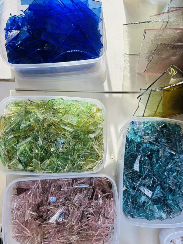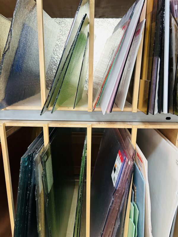 The sheet glass is American made. It is colored from the outset. Many pale, beautiful sheets of colored glass are prepared on the shelves.