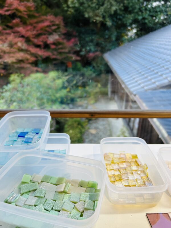 そして、その後はお待ちかねのお皿をデザインします。大きなお皿だと1枚、小さいお皿だと2枚デザインできます。予め小さくカットされたなガラスが準備されていますので、好きな色を好きな配置でデザインしていくのです。タッパに色ごとに分けられた小さなガラス。どんなデザインにするか、サンプルをみながらアドバイスをいただきつつ好きな色を選んで配置していくのはなんという楽しいプロセスでしょう!私は小さなお皿を選び、ブルー系とピンク系のデザインにしました。 窯に入れる作業は佐々木さんがしてくださり、完成したお皿は1週間ほどで自宅に届きます。