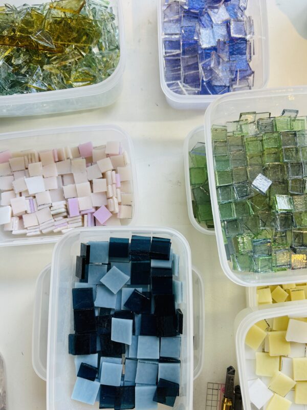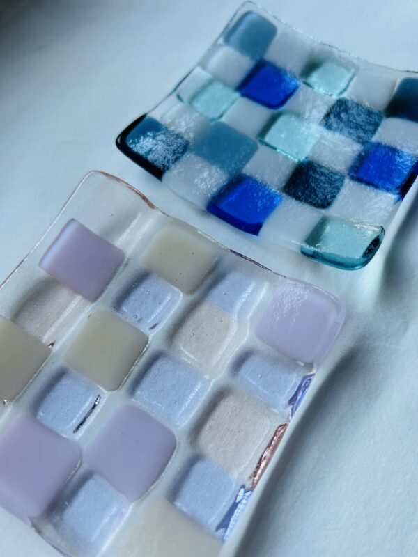 Then came the long-awaited part: designing the plate. I could design one large plate or two small ones. Pre-cut pieces of glass were provided, and you could arrange your favorite colors in any pattern you liked. The small pieces of glass were sorted by color in containers. It was such an enjoyable process to choose colors, arrange them and receive advice while looking at samples! I chose a small plate and designed it with blues and pinks.