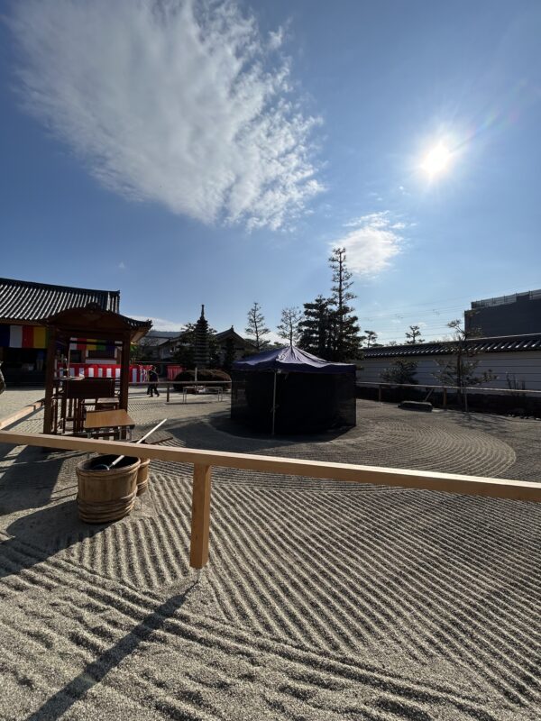 明日は、護摩の残り火を用い、一年間お世話になった御札や御守のお焚き上げをする儀式が山伏によって執り行われます。寺社・宗派を問わず古札を持ち込めます。普段は広い石庭ですが、真ん中には護摩壇の木や枝が積み上げられていました。大きな炎で1年間の厄を燃やします。