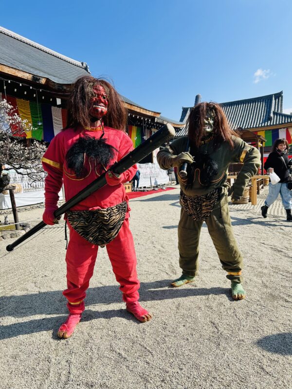 Demon characters made an appearance for the Setsubun festival. They were instantly surrounded by worshippers eager to take photos with them. When a woman asked them to stand side by side, the blue and red demons obediently lined up and struck a pose. The demons of Shogoin, reformed through the teachings of Shugendo, were kind indeed.