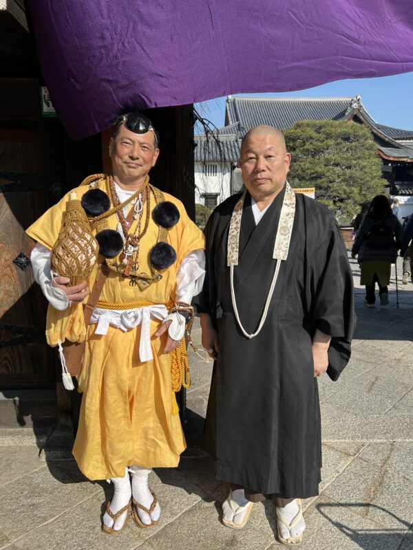 As I walked towards the temple, I could hear the sound of a conch shell (horagai) drifting in from afar. Could I possibly meet a mountain ascetic? I hoped so and drew nearer, finding one standing before the temple gate! What luck to hear the conch shell up close! Beside him stood the chief priest, explaining the instrument to the worshippers. Apparently, during the quiet early morning hours, the sound of a conch shell blown in Higashiyama can reach all the way to Shogoin. The person blowing the conch shell was, surprisingly, a new mountain ascetic. He kindly posed for photos with visitors and chatted with us in a friendly manner. When I asked about him, I learned that his was Mr.Matsuda and that he was actually a licensed interpreter-guide working in Kyoto. Although he guides many people through temples and shrines, he joined the Shugendō path because he wanted to understand its essence more deeply. How wonderful!