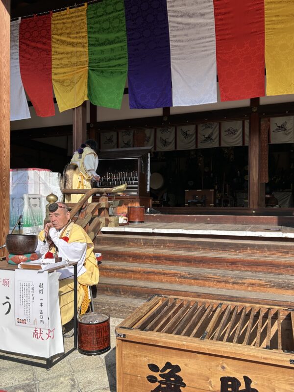 As I entered the gate, a spirited cry of “One candle! One candle!” echoed from within. There was a queue stretching before the main hall of people waiting to offer a candle, and I joined it. The highest-ranking mountain ascetic, who was wearing a red Bonten necklace, welcomed the worshippers. When it was my turn, he performed a deeply appreciated prayer for each person, such as ‘safety for the household’ or ‘freedom from illness and disaster’, while rubbing his prayer beads together to make a distinctive rattling sound.
